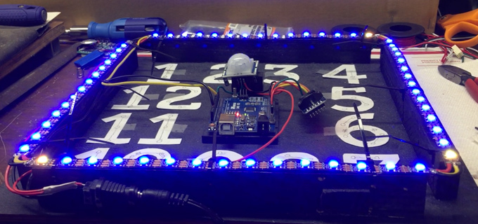 With the basics working, I upped my game with an individually-addressable LED strip and PIR (passive infrared) sensor. A strip of 60 LEDs meant that I could light up the specific minute of the hour. I also made each 15 minute interval orange instead of blue to make it easier to count at a quick glance.