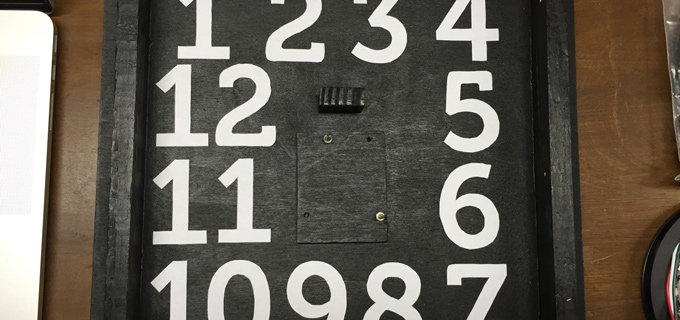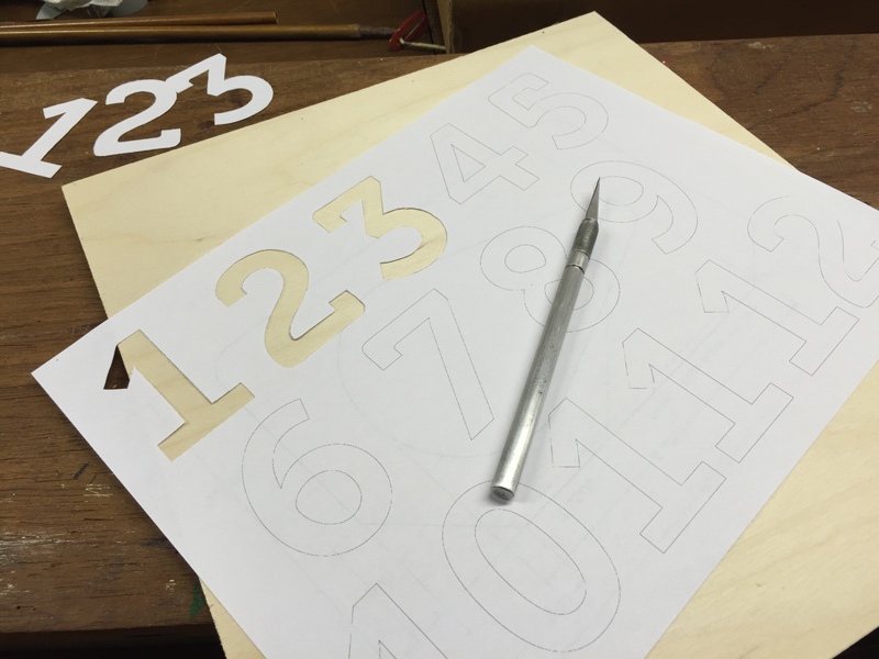 The vision here is to place a two-way mirrored piece of plexiglass on top, and the numbers will be 3D printed and individually lit with LEDs. This way it acts as a mirror, and when you walk up to it, the time will be displayed. To understand the size and placement, I printed the numbers to scale and cut them out by hand.